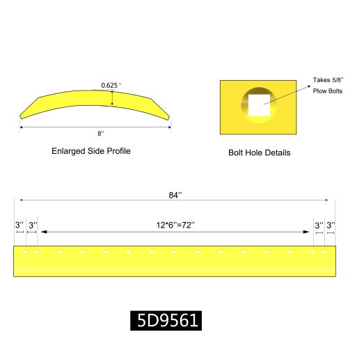 Caterpillar style 5/8" x 8" x 7' curved, heat treated, 15 hole grader blade; takes 15 - 5/8" x 2 3/4" (625x275) plow bolts and 15 - 5/8" (625 hex nut) hex nuts